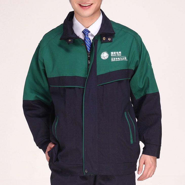 熱轉印LOGO:工作服前胸有“國家電網”標志,專為北京電力公司定做量身定做,字體清晰美觀。
