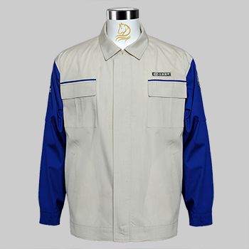 北京現代工作服正面圖:藍白經典配色,簡潔大方,視覺上更端莊大方,兜口上方點綴條形藍色,更能提高服裝的美觀性