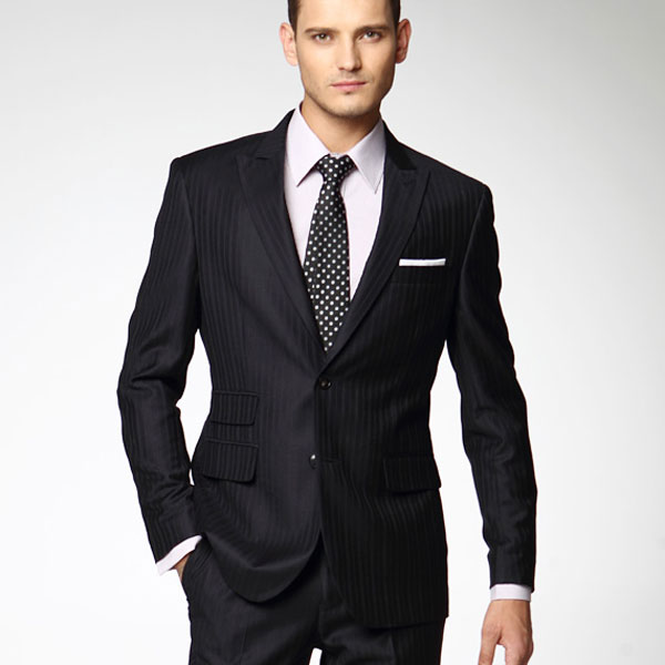 本款男士黑色寬條紋商務西裝選用優質男士西裝面料定制而成,黑色西裝搭配寬條紋紋理顯得非常的與眾不同。