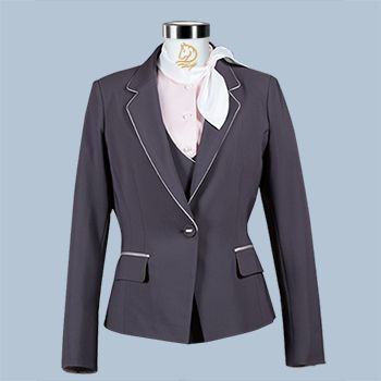 西服馬甲套裝: 斜門襟,門襟側面鑲粉色的牙與西服外套相呼應。馬甲肩部加上粉色的絲帶,添加女性的柔美。